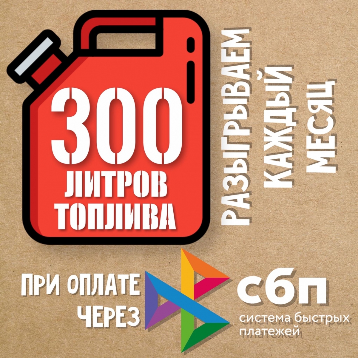 Каждый месяц среди заправок, оплаченных через СБП, мы будем разыгрывать 300 ЛИТРОВ ТОПЛИВ